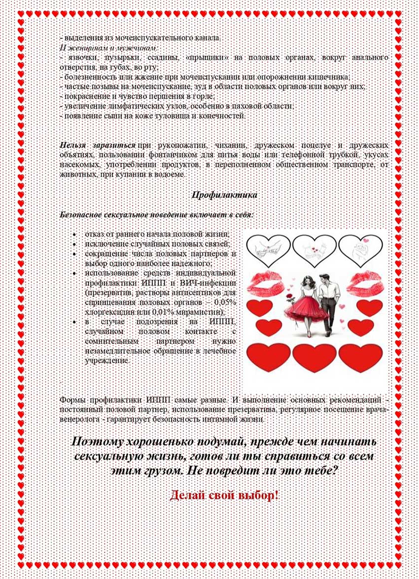 Таким образом, не смотря на достаточно широкое распространение ИППП и ВИЧ-инфекции, выполнение простейших рекомендаций (отказ от раннего начала половой жизни, постоянный половой партнер, исключение случайных половых контактов, использование презерватива и других средств индивидуальной защиты) гарантирует безопасность интимной жизни и сохранение здоровья.