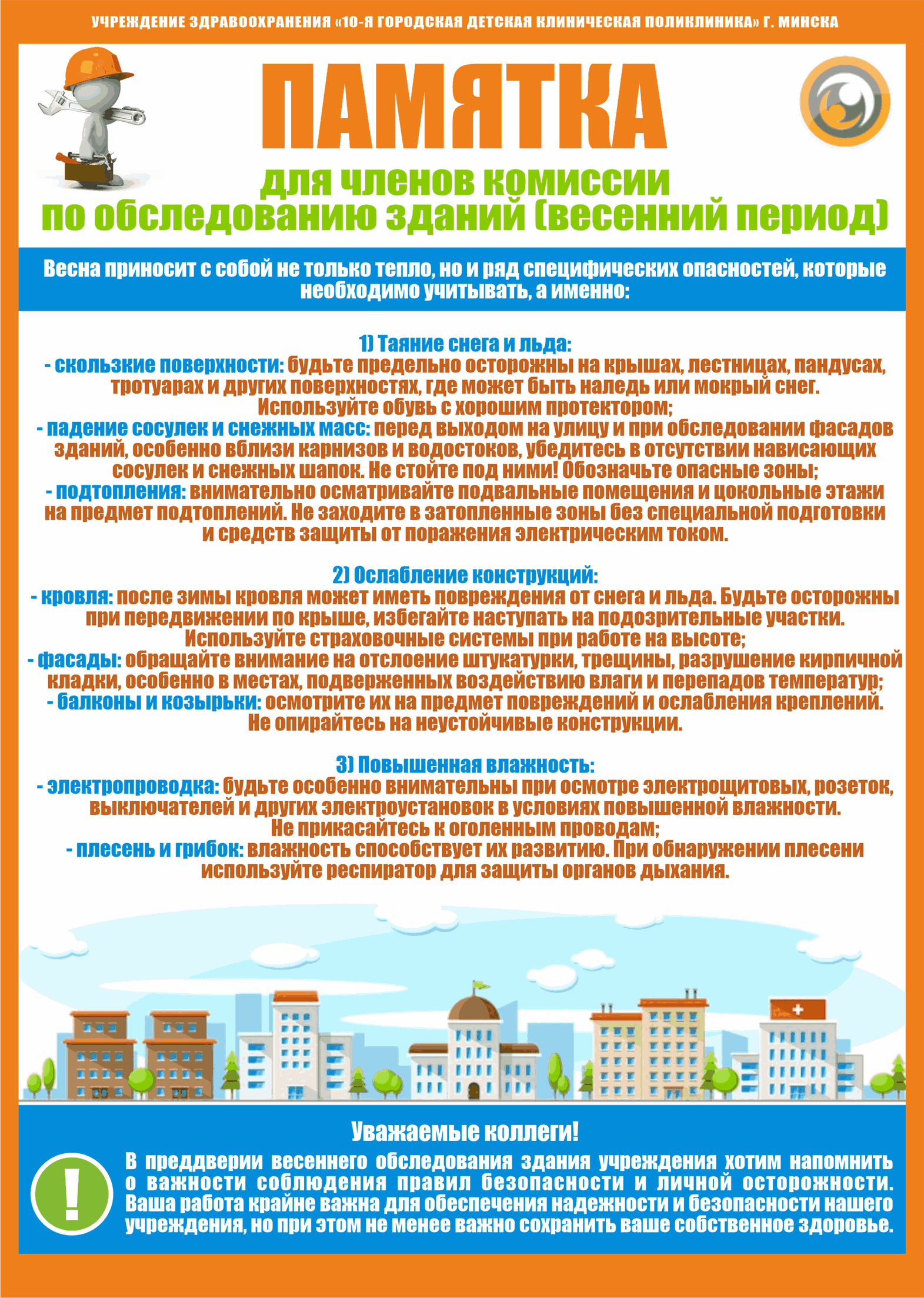 В период с 23 по 27 марта 2026 года в учреждении здравоохранения «10-я городская детская клиническая поликлиника» проходит Неделя нулевого травматизма (далее – ННТ) по теме: «Обеспечение безопасности труда при проведении весеннего осмотра зданий и сооружений».