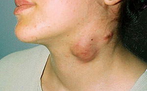 Характерный признак туляремии – увеличение лимфатических узлов, размеры которых могут быть от горошины до грецкого ореха. Возможно изолированное или сочетанное поражение различных групп лимфатических узлов – подмышечных, паховых, бедренных.